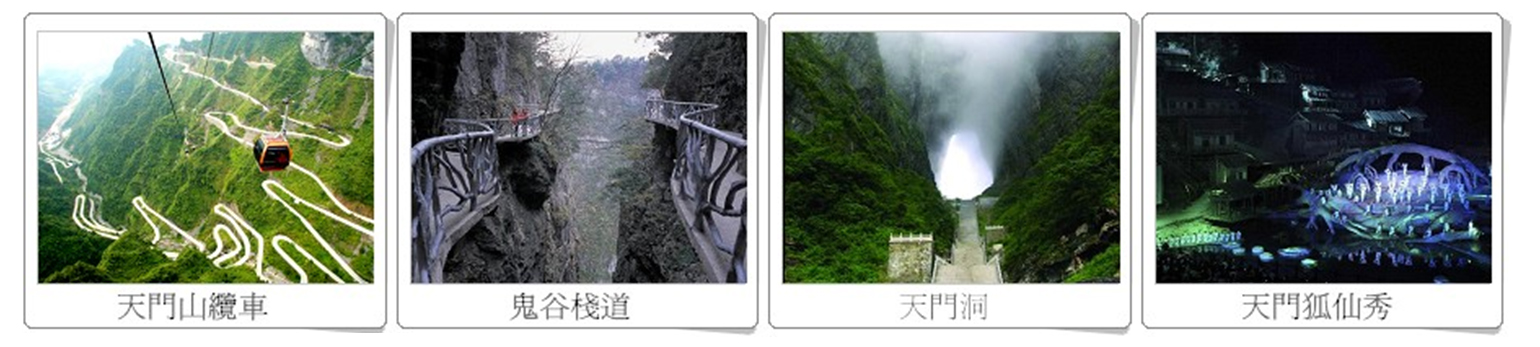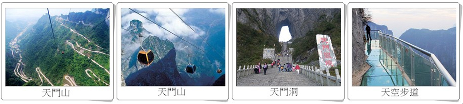 | DAY3 | 鳳凰「高速車程約3.5小時」-張家界天門山國家公園【天門山(含纜車上或下)+天門洞(含環保車+單程手扶電梯)+鬼谷棧道+天空步道(含鞋套)、土家風情園、贈送欣賞天門狐仙秀】 |