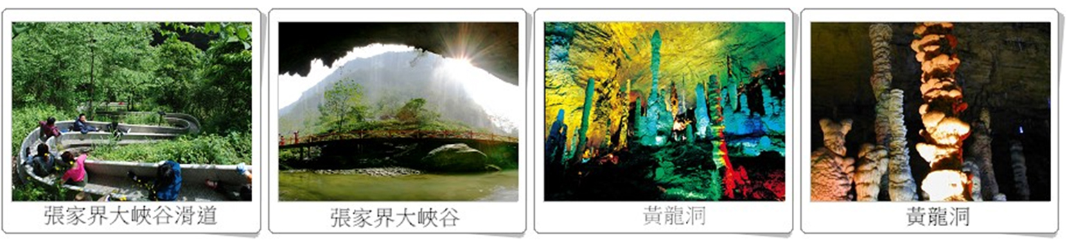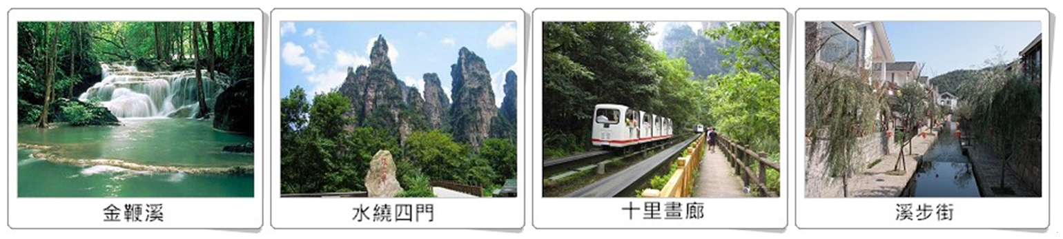 | DAY4 | 張家界國家森林公園【金鞭溪、水繞四門、十里畫廊(不含小火車)、大峽谷(滑道+遊船+防滑手套)、贈送欣賞魅力湘西秀】 |