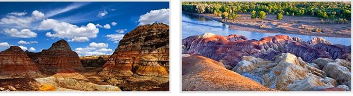 | ● | 【五彩河岸(五彩灘)】是以「怪異、神秘、壯美」而著稱的雅丹地貌。千百年來,由於地殼的運動,在這裡形成極厚的煤層,後幾經滄桑,覆蓋地表的沙石被風雨剝蝕,使煤層暴露,在雷電和陽光的作用下燃燒殆盡,就形成了這光怪陸離的自然景觀;寬闊的額爾齊斯河河灘上,高聳的「山峰」、幽深的「峽谷」,錯綜的「街道」,縱橫的「溝壑」,在夕陽下顯得斑斕而又神奇,一切都沐浴在柔和的光線中,迷離而虛幻。 |