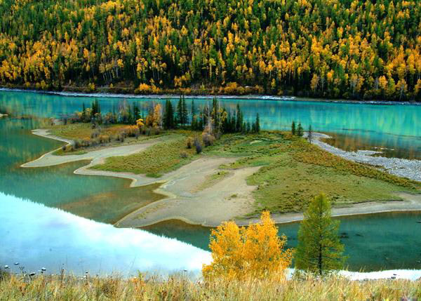 | ● | 【臥龍灣】是因喀納斯河長期沖刷河岸形成的寬闊河灣,風光秀美,令人神往。河灣中心恰好有一座小島,從高處看,酷似一條翼龍靜臥水中,臥龍灣以此得名。迎面朝西望去,便是傲然矗立的波勒巴岱山,積雪終年不化,景色十分壯觀。 |