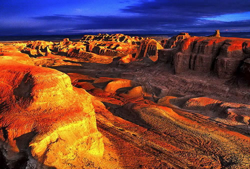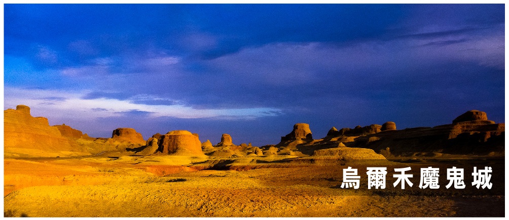 | ● | 【烏爾禾魔鬼城】(含區間車,乘小火車遊覽)當地人蒙古人將此城稱為「蘇魯木哈克」,哈薩克人稱為「沙依坦克爾西」,意思都是為魔鬼城;這裡因雅丹地貌而聞名於世,雅丹是維吾爾語「陡壁的小丘」之意,面積數十平方公里,是在乾旱、大風環境下形成的一種風蝕地貌類型。遠眺風城,宛若中世紀的一座古城堡,大小堡群林立,高矮參差錯落,到了晚間強風穿過其間,風聲鶴唳,給人一種淒森恐怖之感,此地亦是著名電影《臥虎藏龍》拍片的外景地。 |