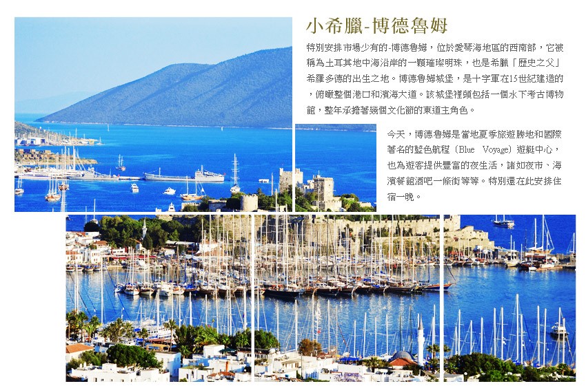 | ● | 【特別安排-遊船徜徉愛情海】徜徉在美麗的愛情海上,白色的房屋與碧藍的海水形成鮮明的對比,悠閒的享受海岸景觀奇瑰壯麗。海濱旁的博德魯姆城堡,古時為聖彼得城堡,為聖約翰武士團所建之十字軍古堡,現為一陳列海底考古所發掘之地中海文明遺物之博物館。傍晚自由時間享受漫步在海濱,博德魯姆的港口與海濱是如詩如畫的散步區,眩目的遊艇停泊港口、美麗的老城本身都值得花時間好好遊覽一番。 |