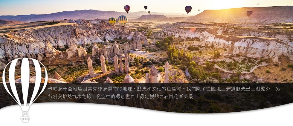 | ● | 【卡帕多奇亞自然奇景】是世界上最壯觀的岩石風化區,此地於3百萬年前,三座火山陸續爆發後,大量的熔岩噴出並覆蓋了地面,經過了長時間風吹雨打,大自然的力量就像一雙雕刻家的巧手般,在這片大地上創作了無數的傑作,更孕育出獨一無二的土耳其石。這裡除了壯麗的景觀之外,卡帕多起亞更有著悠久歷史。西臺人曾在此建立強大帝國,波斯人給他最美的名字「美麗的馬鄉」--Cappadocia。 |