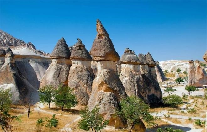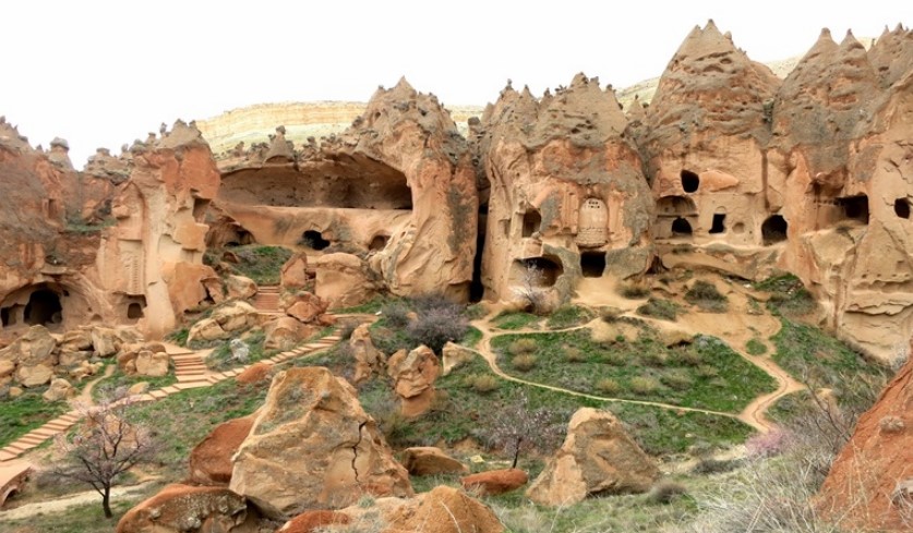 | ● | 【卡帕多奇亞】1985年入選世界遺產,經過長年風化水蝕之特殊景觀-格萊梅山谷與其周圍地區,聳立著形狀不一之岩石丘陵,在這些岩面上開鑿了上千個洞窟,大多是羅馬帝國統治下潛逃之基督修士所建之修院與聖堂。此地亦能看見穴居式村莊和地下城鎮-這些歷史可追朔至西元四世紀時的傳統人類居地遺址。 |